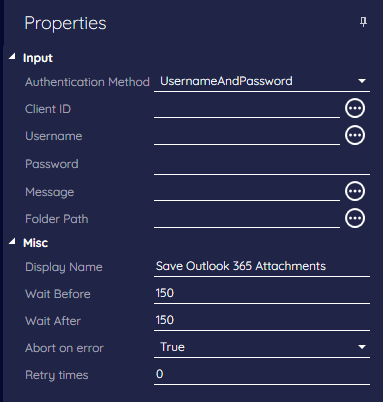 * **Output**: set an existing variable or define a new one that stores the captured value. Must be of type **List\<Microsoft.Graph.Message>.**